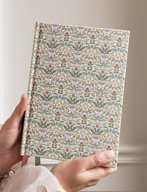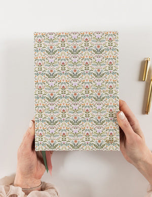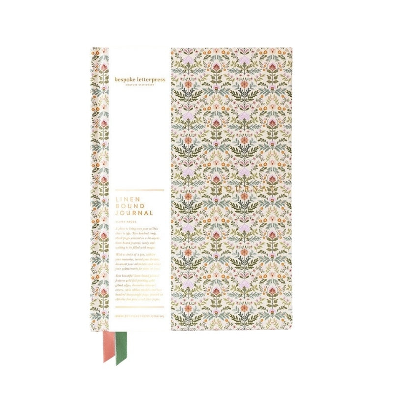 Bespoke Letterpress' new beautiful linen bound journal features gold foil printing, gold gilded edges, decorative internal covers, satin ribbon markers and two hundred heavyweight pages printed on chlorine-free pure wood fibre paper.