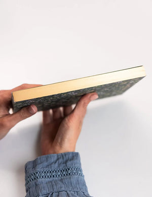Featuring 100 heavyweight tear off blank pages. Bound with a gummed edge, and full heavyweight wrap around cover. Removable Gold Foil printed Bellyband and gold foil and gilded edges.