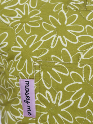 Introducing the Field Quilted Bag, your new go-to tote with a playful twist. Made from 100% cotton, this lightweight bag features a hand-drawn daisy outline print in soft pale yellow on an olive-chartreuse background. Designed for versatility, this soft yet structured tote is the perfect carryall for daily errands, beach days or even as a chic nappy bag.