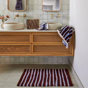 Small but mighty, the Strokes Hand Towel pulls its weight in both style and softness. With hand-drawn burgundy and periwinkle stripes and a blush pink trim, it’s playful, polished, and always noticed. Ideal for drying hands or subtly impressing guests.