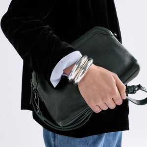 The Aisem Bangle is a sculptural closed-end bangle in shiny metallic finish with a hinge opening and hidden catch for added security. This timeless understated design adds shine and sophistication to any outfit. Perfect for layering with multiple bangles or styling with our other Aisem pieces as part of a set.