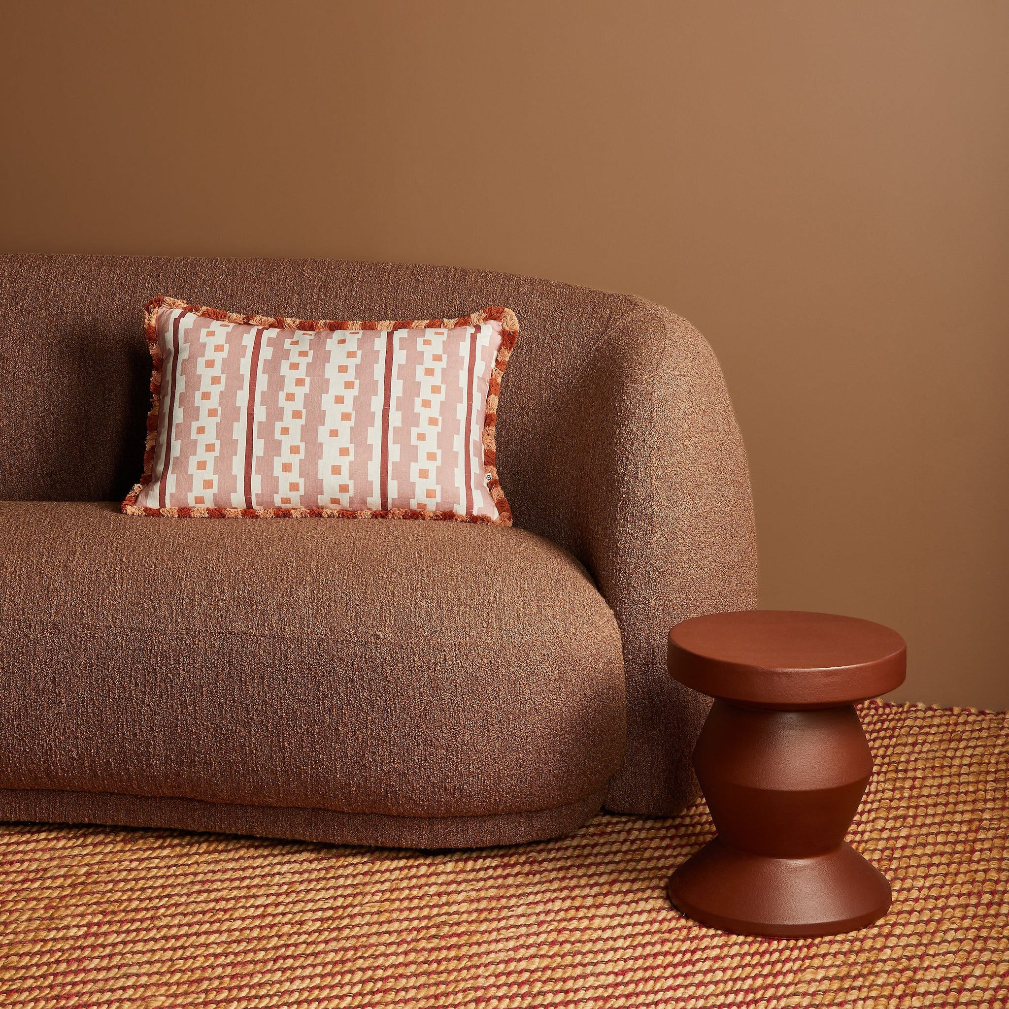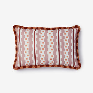 Inspired by Bauhaus-era weaving, this buff pink linen cushion features bold geometric patterning and a stripe fringe. Structured yet tactile, it brings art-led design to interiors.