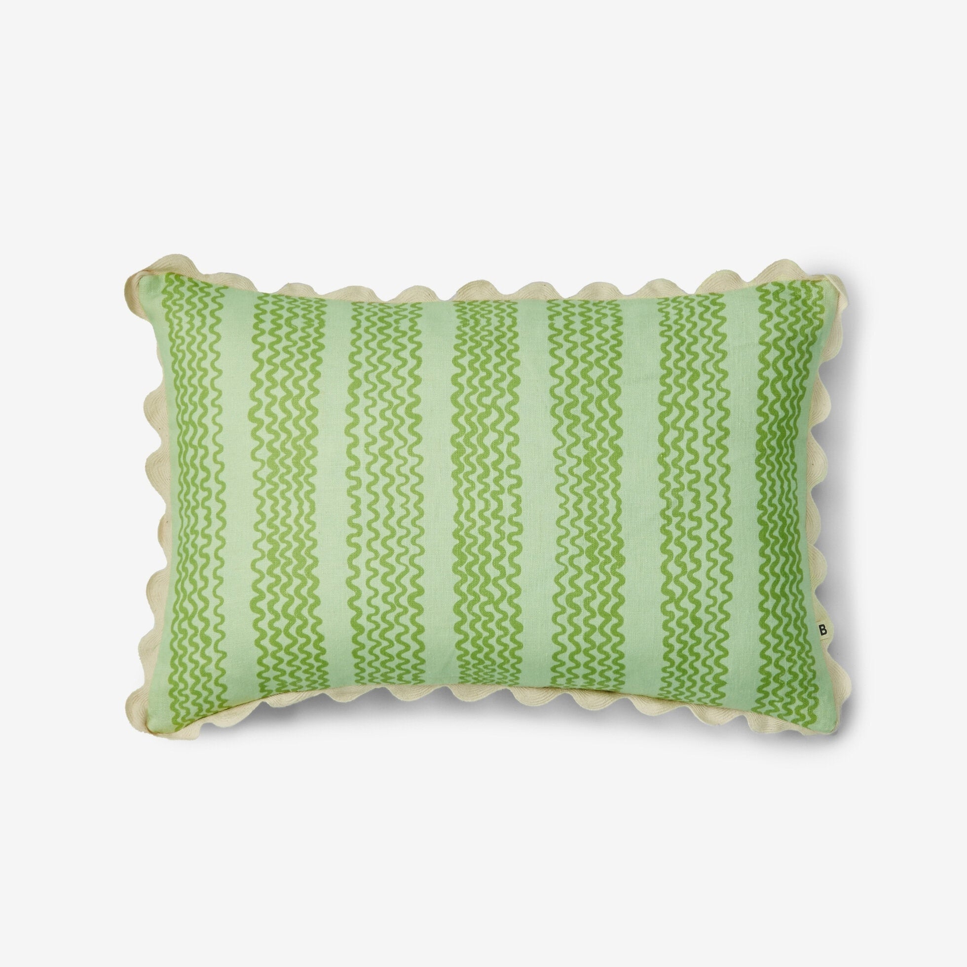 Flowing wave-like mint green lines move across this linen cushion. Light and rhythmic, it brings softness and gentle pattern.