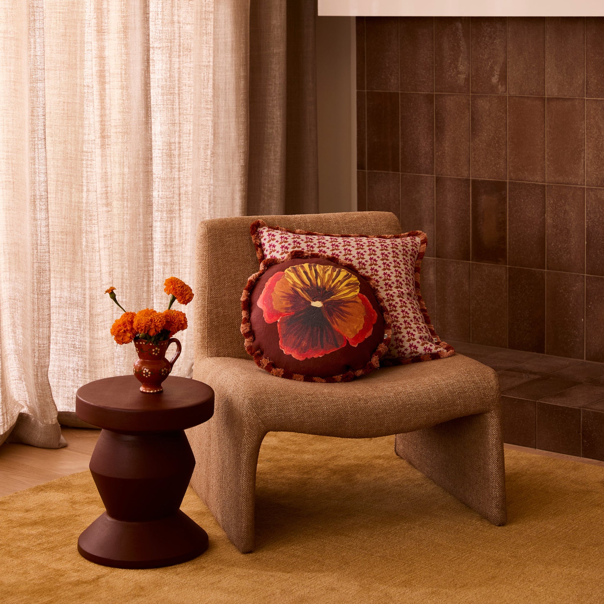 Deep chocolate linen is softened with an expressive wild pansy in this round cushion. Rich and romantic, it adds depth and warmth to layered styling.